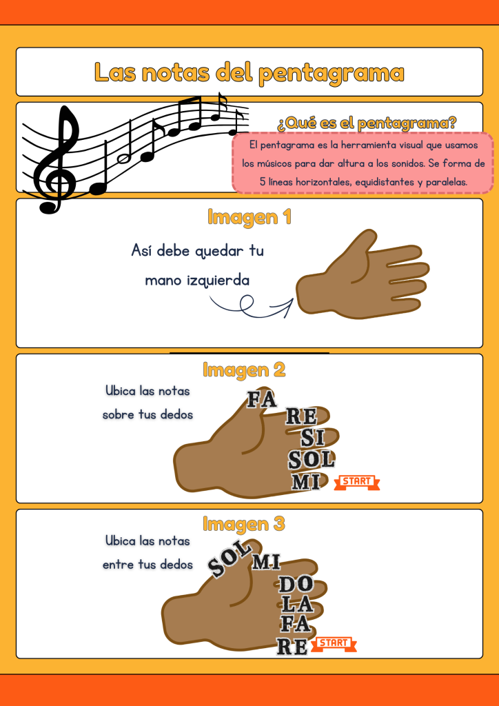 En este podcast, los niños ocuparán una hoja en blanco, donde dibujarán su mano como se indica en la hoja de trabajo. Posteriormente, escribirán sobre los dedos y entre ellos el nombre de las notas, esta guía la pueden guardar para repasar y reforzar.